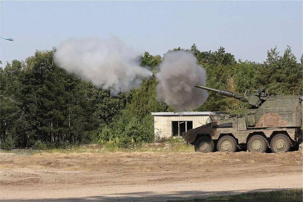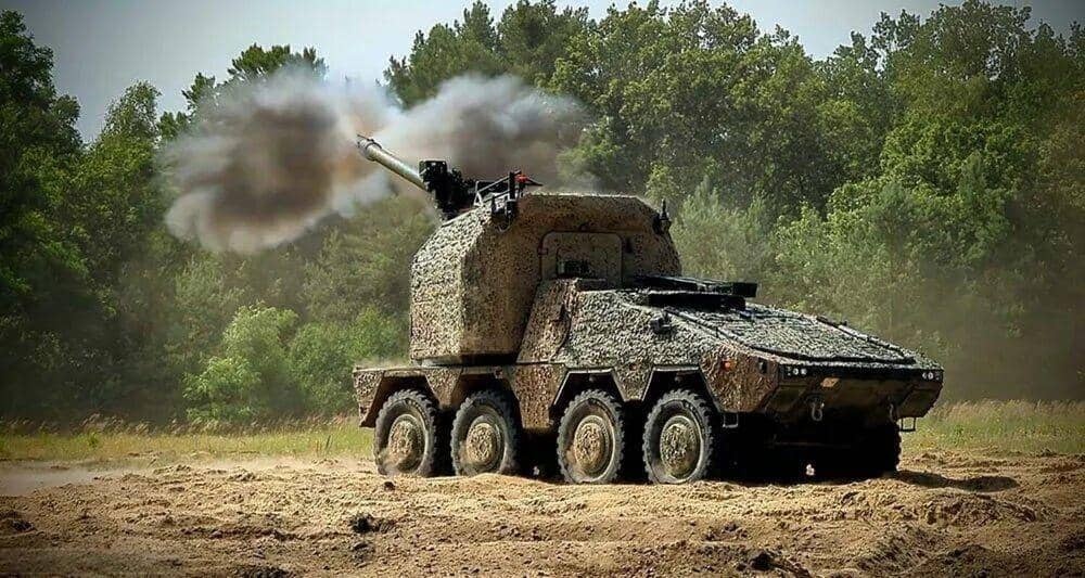The self-propelled howitzer utilizes the "Boxer" wheeled armored personnel carrier chassis.