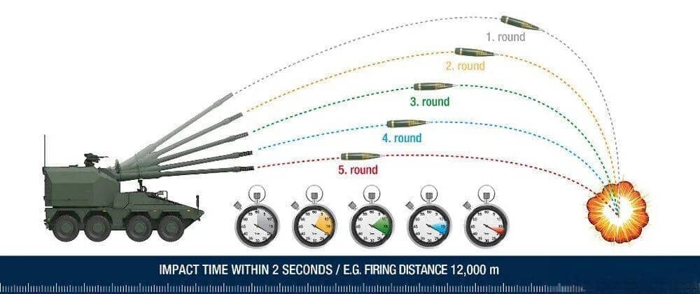 The unmanned turret is derived from the artillery module developed by Krauss-Maffei Wegmann (KMW) and features fully remote-controlled operation, allowing the gunner to operate it from within the hull of the Boxer wheeled armored vehicle. The unmanned turret houses rounds and is equipped with the "Multiple Rounds Simultaneous Impact (MRSI)" capability, which means it can fire multiple rounds that follow different trajectories to hit a single target simultaneously—a function typically found only in top-tier artillery systems.